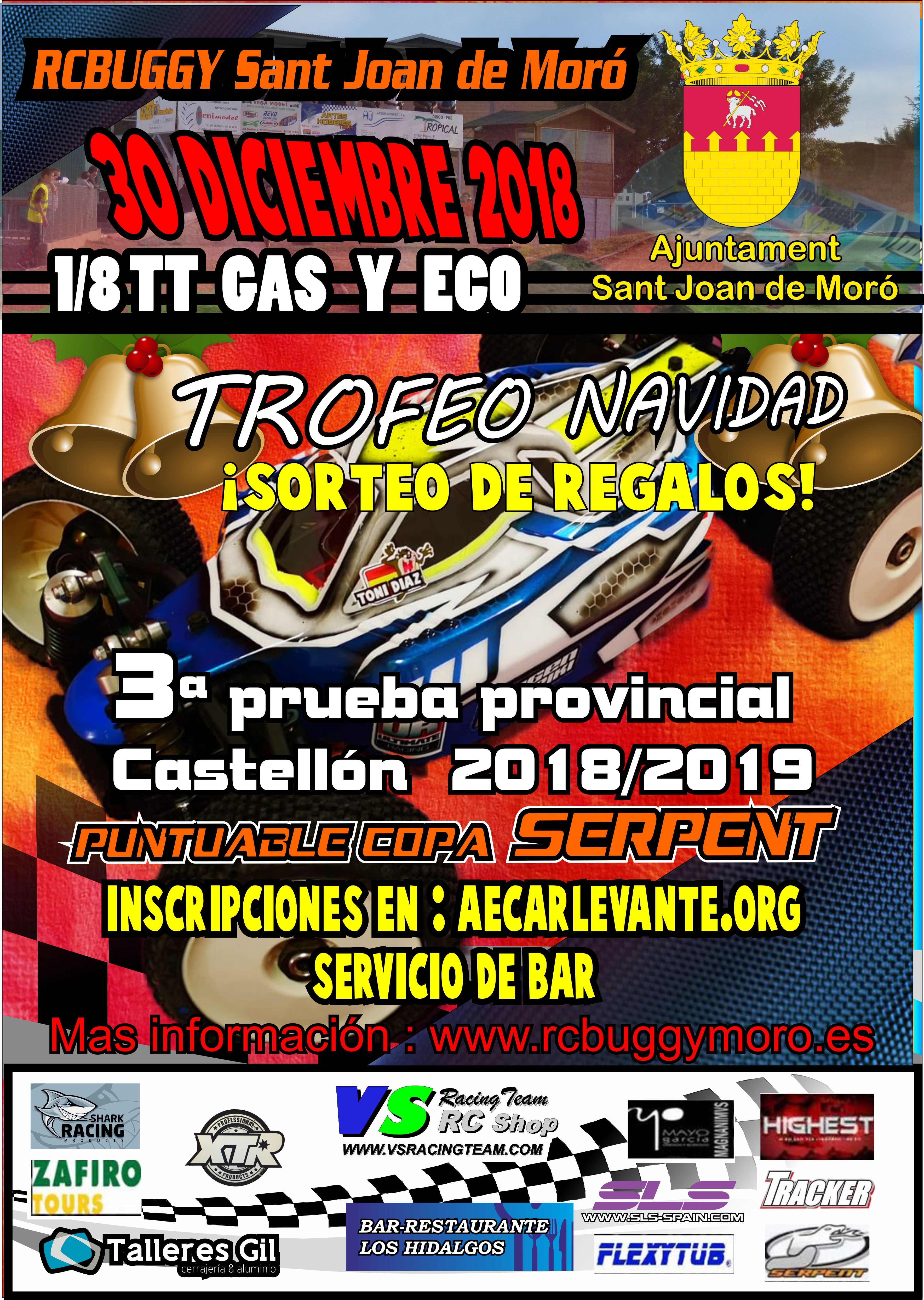 El pasado domingo 30 de diciembre de 2018, se disputó la 3ª prueba del Campeonato Provincial de Castellón, Trofeo de Navidad, con sorteo de regalos entre todos los participantes al termino de la carrera. Con una participación muy buena de 30 pilotos venidos desde Valencia, Castellón y Catalunya, el esquema de la carrera fue de 3 series de 10 pilotos en mangas y finales.